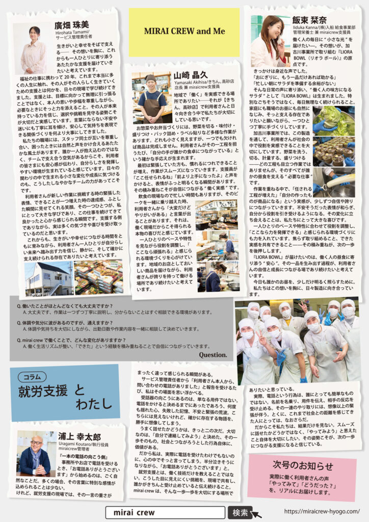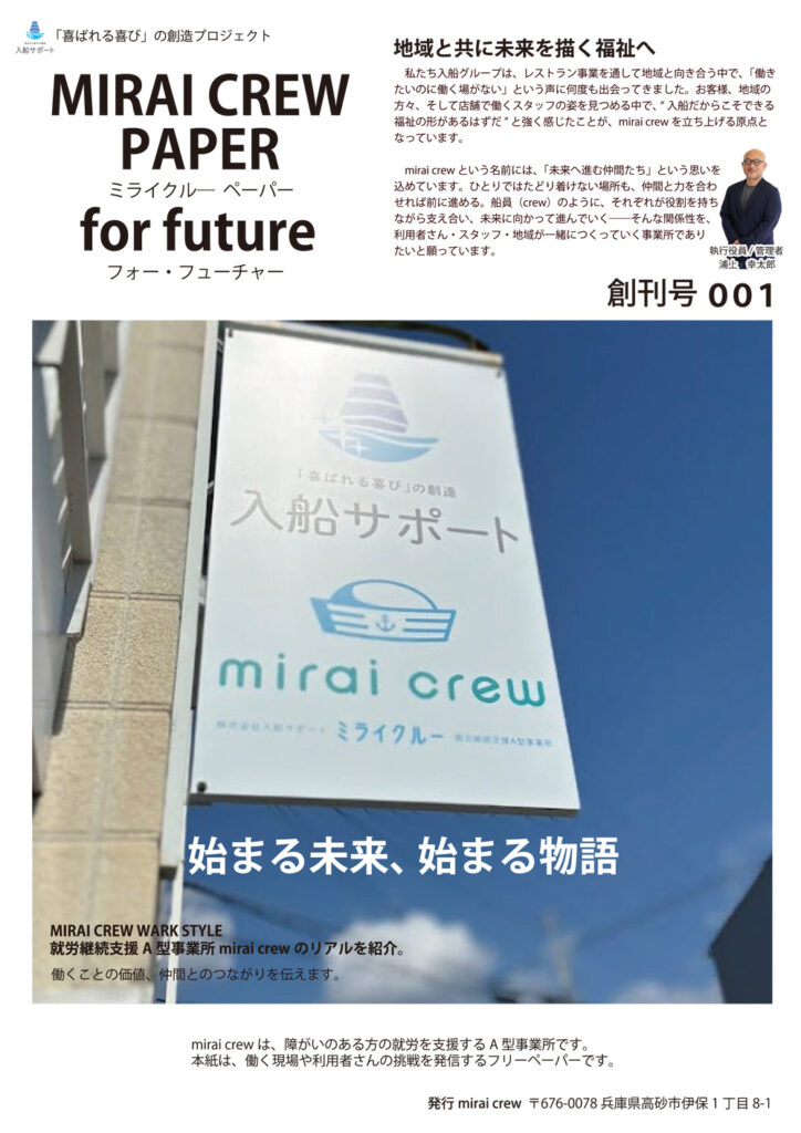 このたび、(株)入船サポートが運営する就労継続支援A型事業所【mirai crew(ミライクルー)】では、様々な取り組みや、現場で生まれる小さな変化・日々の声をお届けする不定期情報発信通信『MIRAI CREW PAPER(ミライクルーペーパー)』 を創刊いたしました。